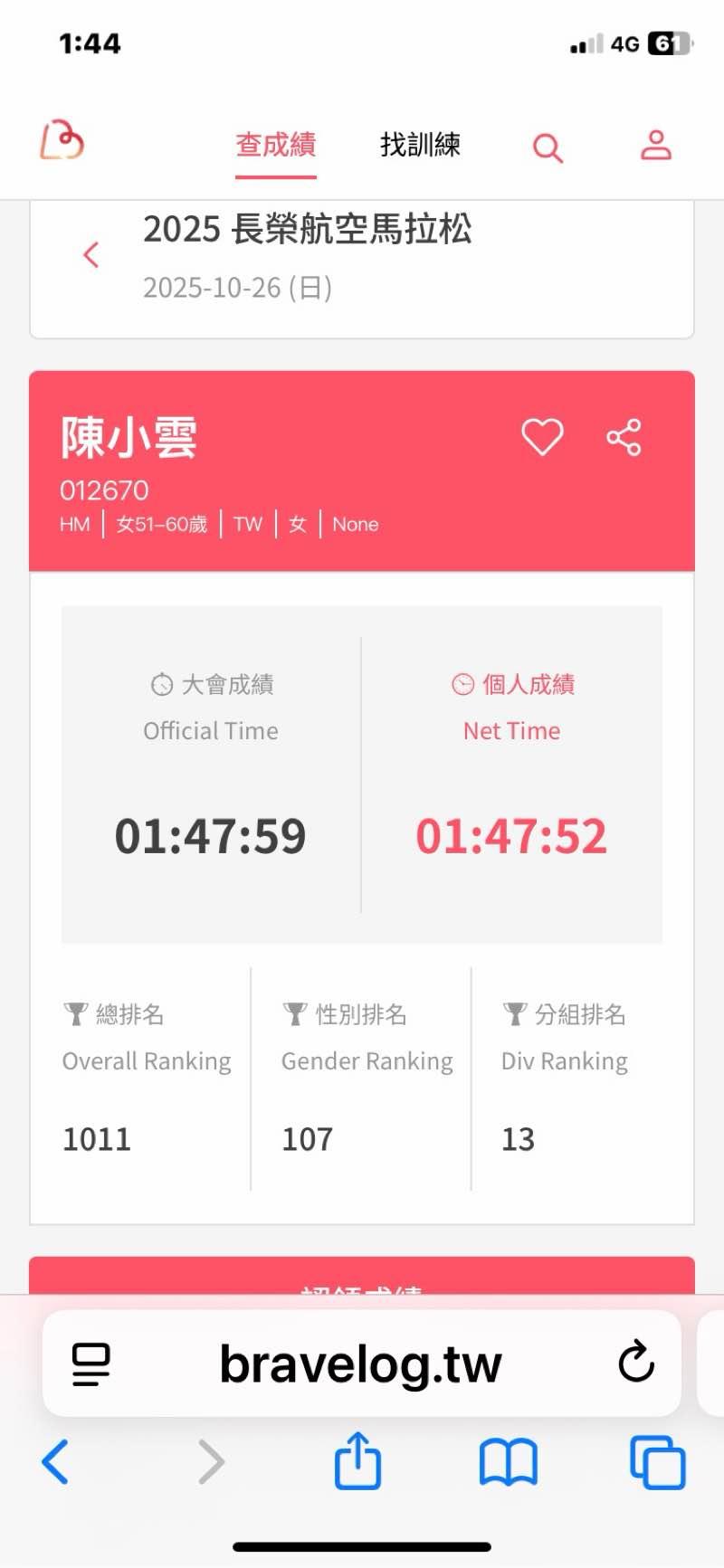 2026/01/11 賀!小雲 破PB - 全馬 | 03:40:20