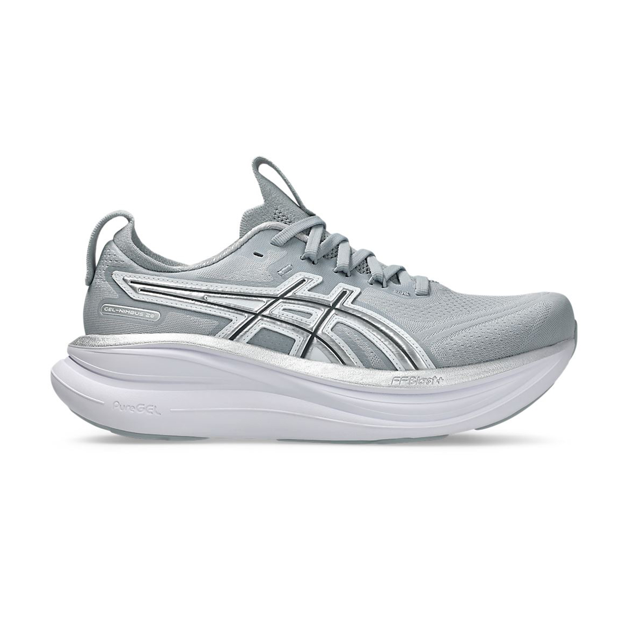 GEL-NIMBUS 28 ATC復古系列,採用針織網布鞋面,搭配象徵千禧年風格的金屬光澤LOGO,
