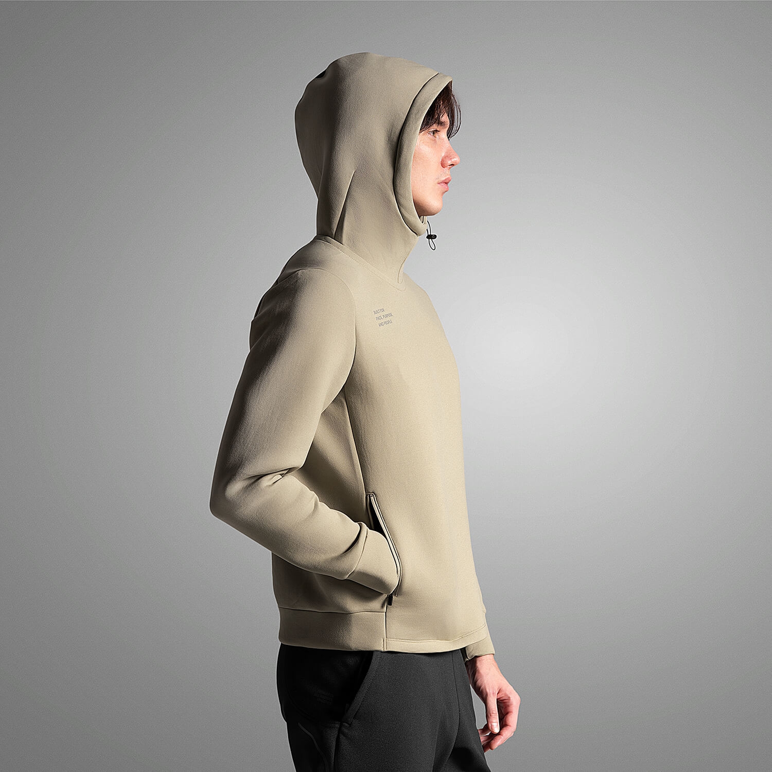 這件跑前訓練連帽上衣,正是為了在暖身、緩跑、或通勤前往場地的路上,提供剛剛好的保暖與無負擔的輕盈。