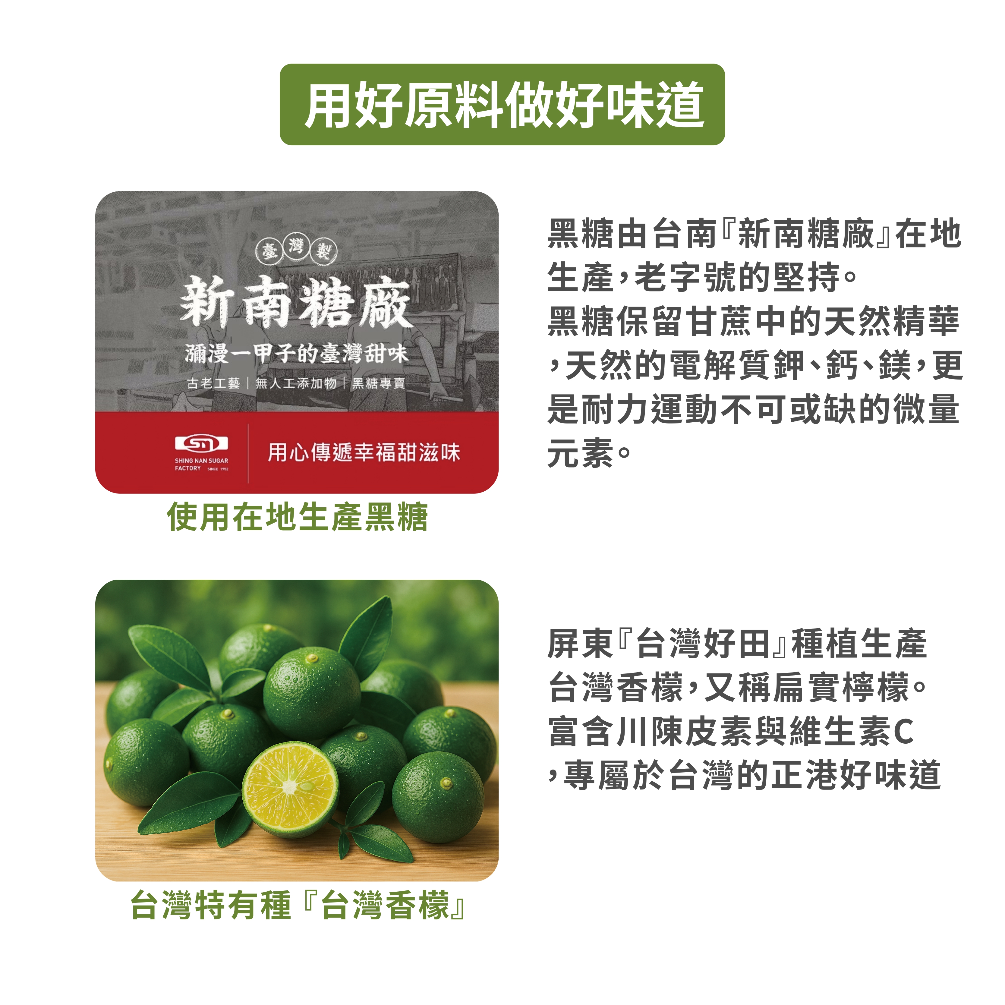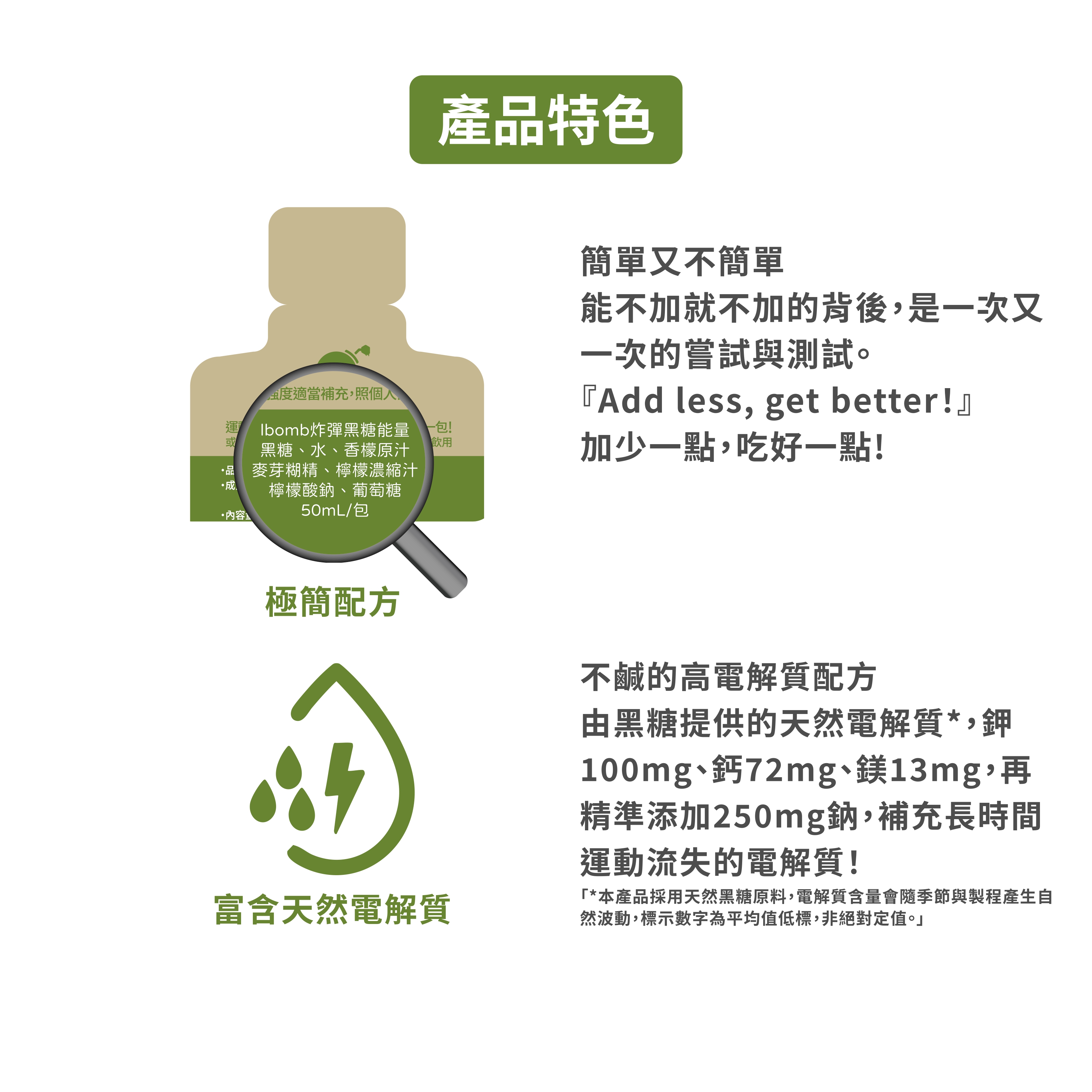 ★ 低鈉負擔:利用黑糖天然的電解質,比起化學合成的鹽錠,對腸胃的刺激性更低。