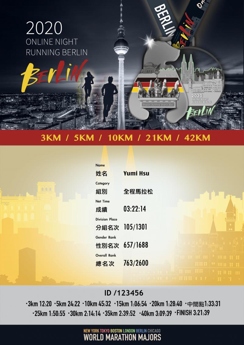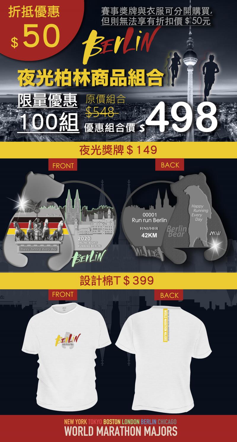 夜跑柏林商品組合(限量優惠100組)(加購商品頁面中 同時購買獎牌與衣服可現折50元)原價$548限量組合優惠價$498元