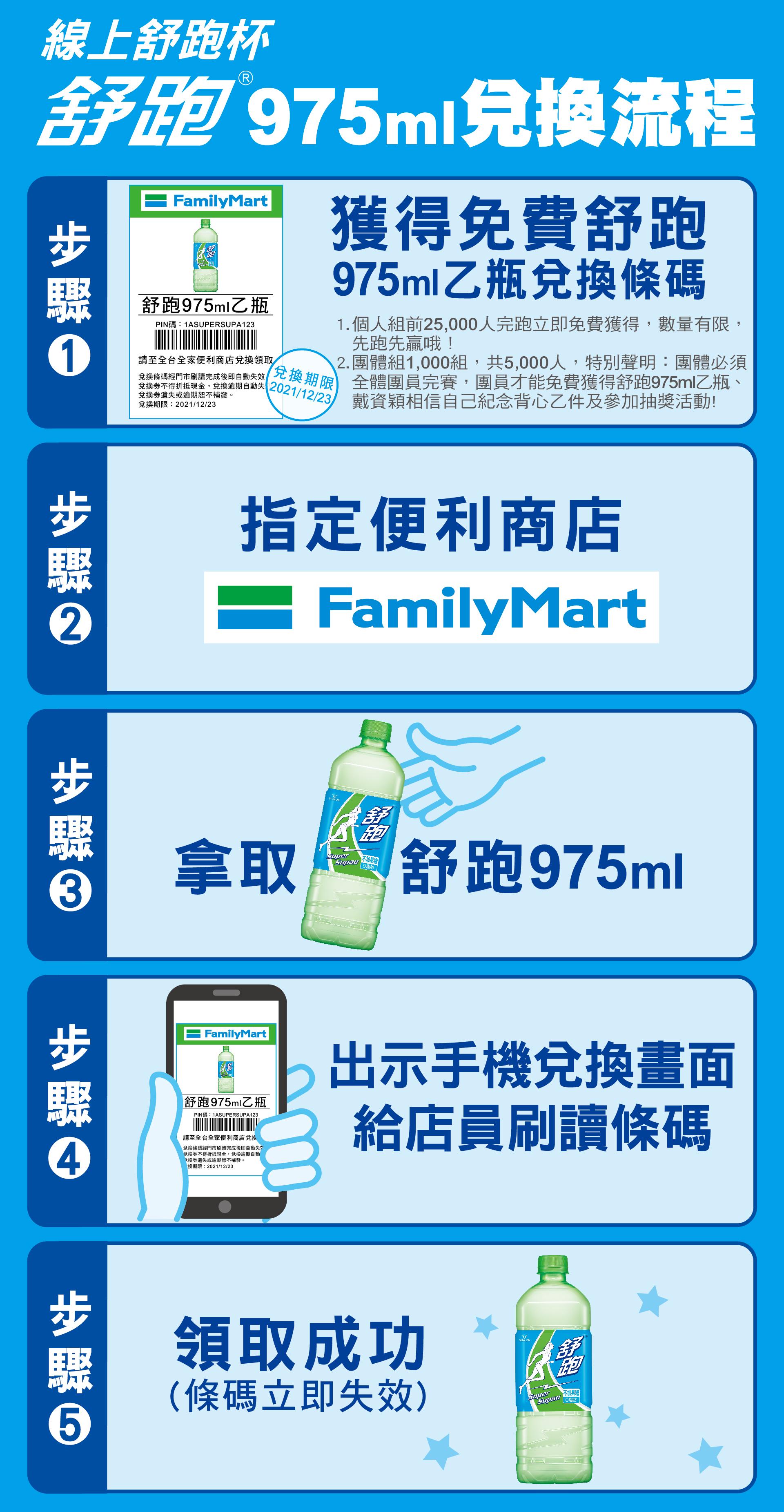 ●個人組前25,000人完跑者立即免費獲得,數量有限,先跑先贏哦!●團體組1,000組,共5,000人,特別聲明:團體必須全體團員完賽,團員才能免費獲得舒跑乙瓶