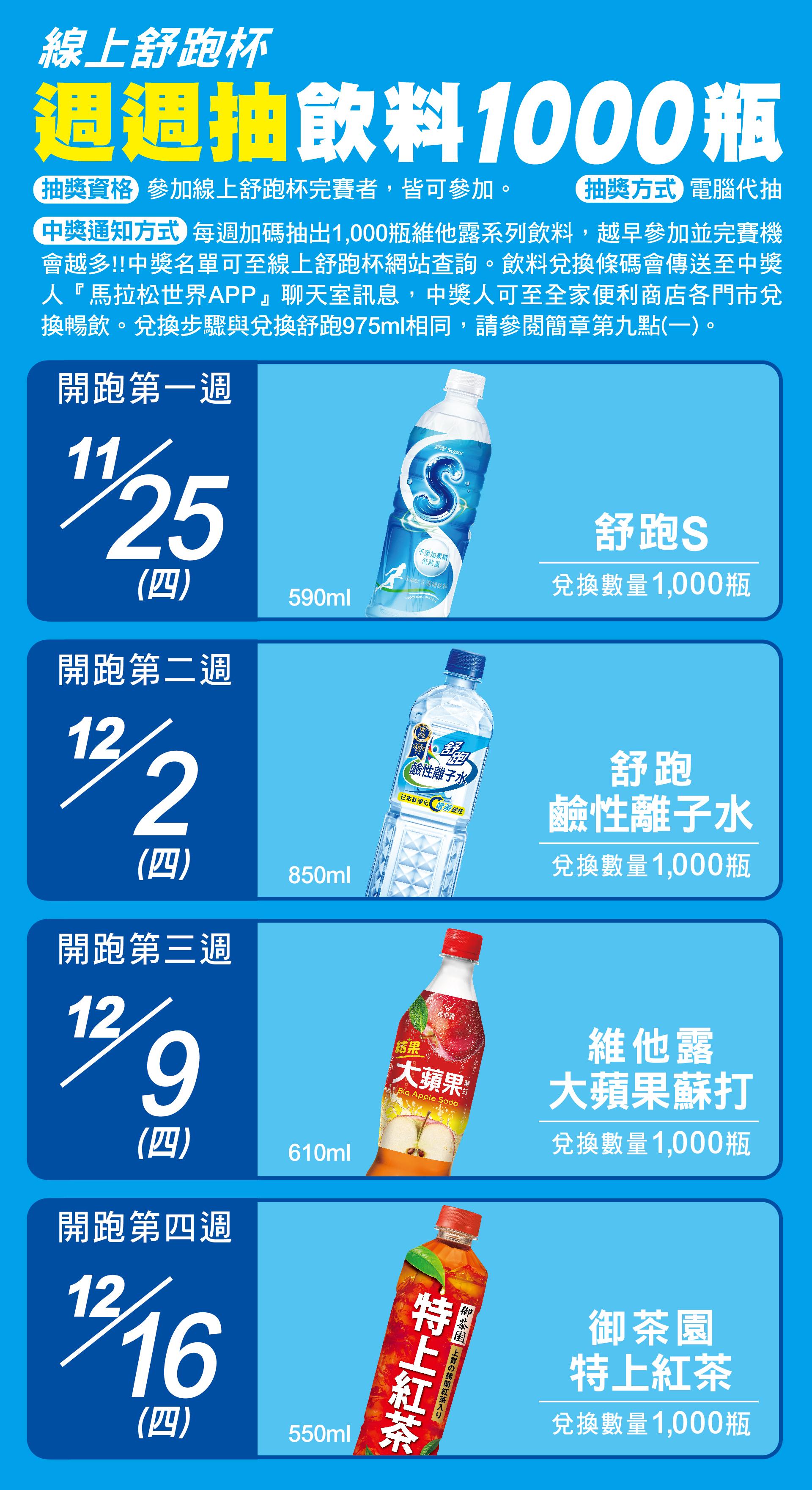 (三)週週抽飲料1000瓶:兌換期限2021 / 12 / 23(四)抽獎資格:參加線上舒跑杯完賽者,皆可參加。抽獎方式:電腦代抽中獎通知方式:每週加碼抽出1,000瓶維他露系列飲料,越早參加並完賽機會越多!!中獎名單可至線上舒跑杯網站查詢。飲料兌換條碼會傳送至中獎人『馬拉松世界APP』聊天室訊息,中獎人請至指定便利商店兌換暢飲。兌換步驟與兌換舒跑975ml相同,請參閱簡章第九點(一)。