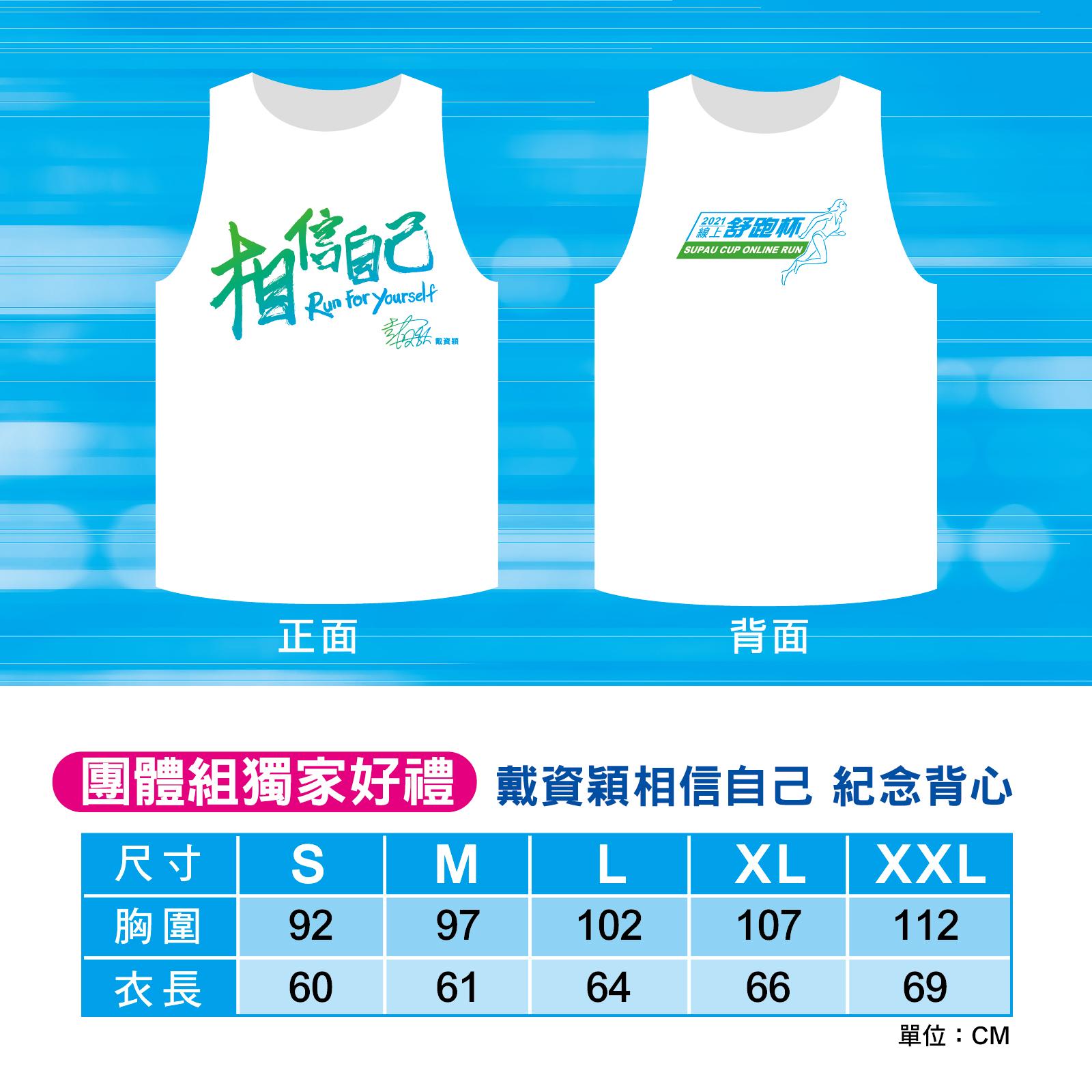 (五)、團體組獨家好禮—戴資穎相信自己紀念背心團體組每組共五件,團員可選自己背心尺寸,提供給團長,尺寸確認後恕無法更改。團體組五名團員必須全部完賽後才符合領取資格。主辦單位將於活動結束後免費宅配寄送給團長,由團長分發團員。
