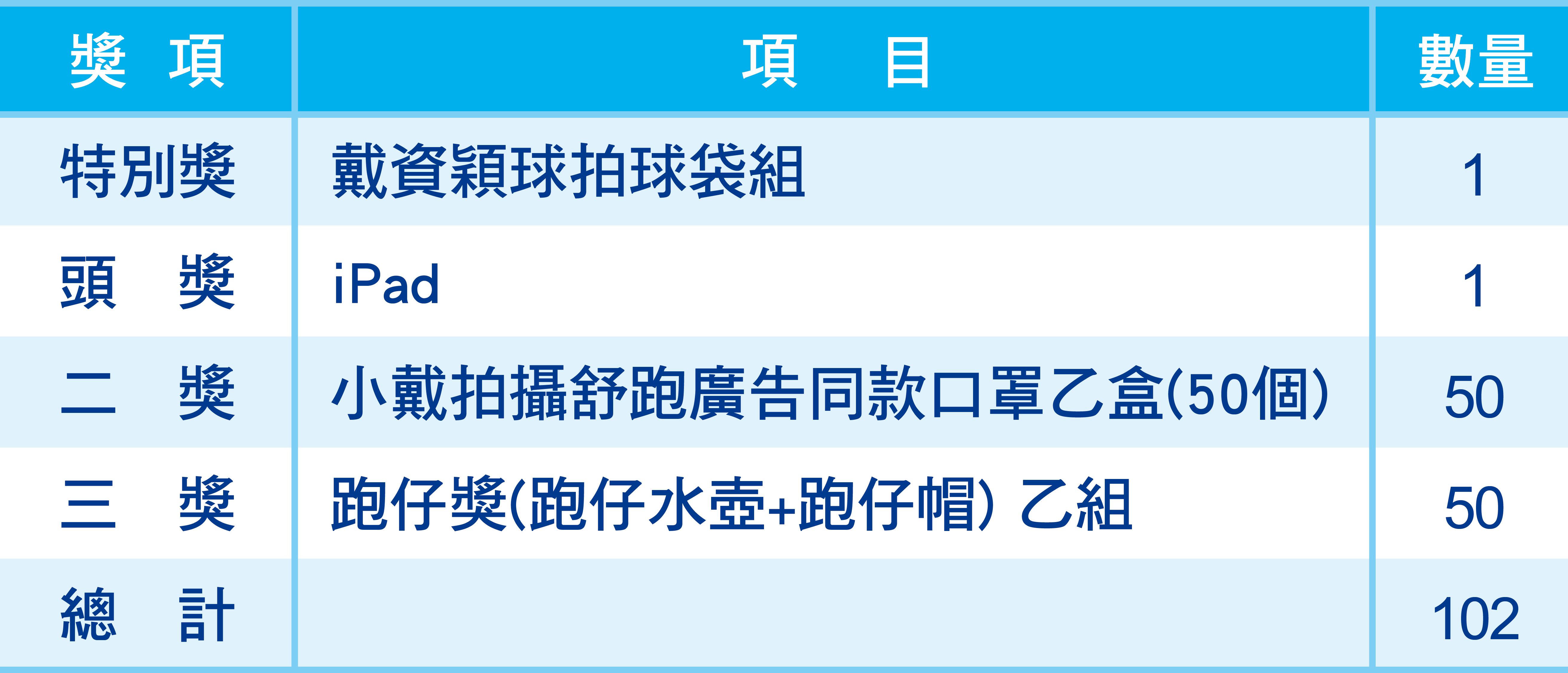 (四)完賽抽獎 - 抽戴資穎球拍球袋組、ipad等大獎凡參加線上舒跑杯完賽者,皆可獲得抽獎資格,大會於12/16(四)下午6:00公佈中獎名單於線上舒跑杯網站,並簡訊通知中獎者。請中獎者於2021/12/24(五)回覆簡訊內表單內容。