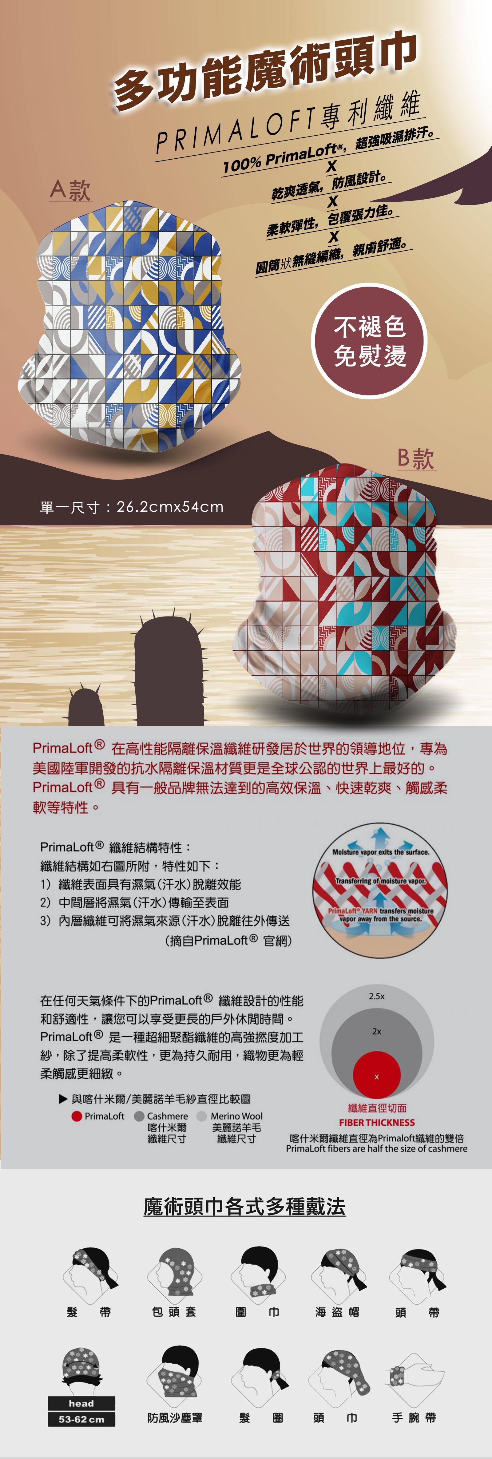- 100% PrimaLoft®,超強吸濕排汗。- 乾爽透氣,防風設計。- 柔軟彈性,包覆張力佳。- 圓筒狀無縫編織,親膚舒適。- 不褪色、免熨燙。