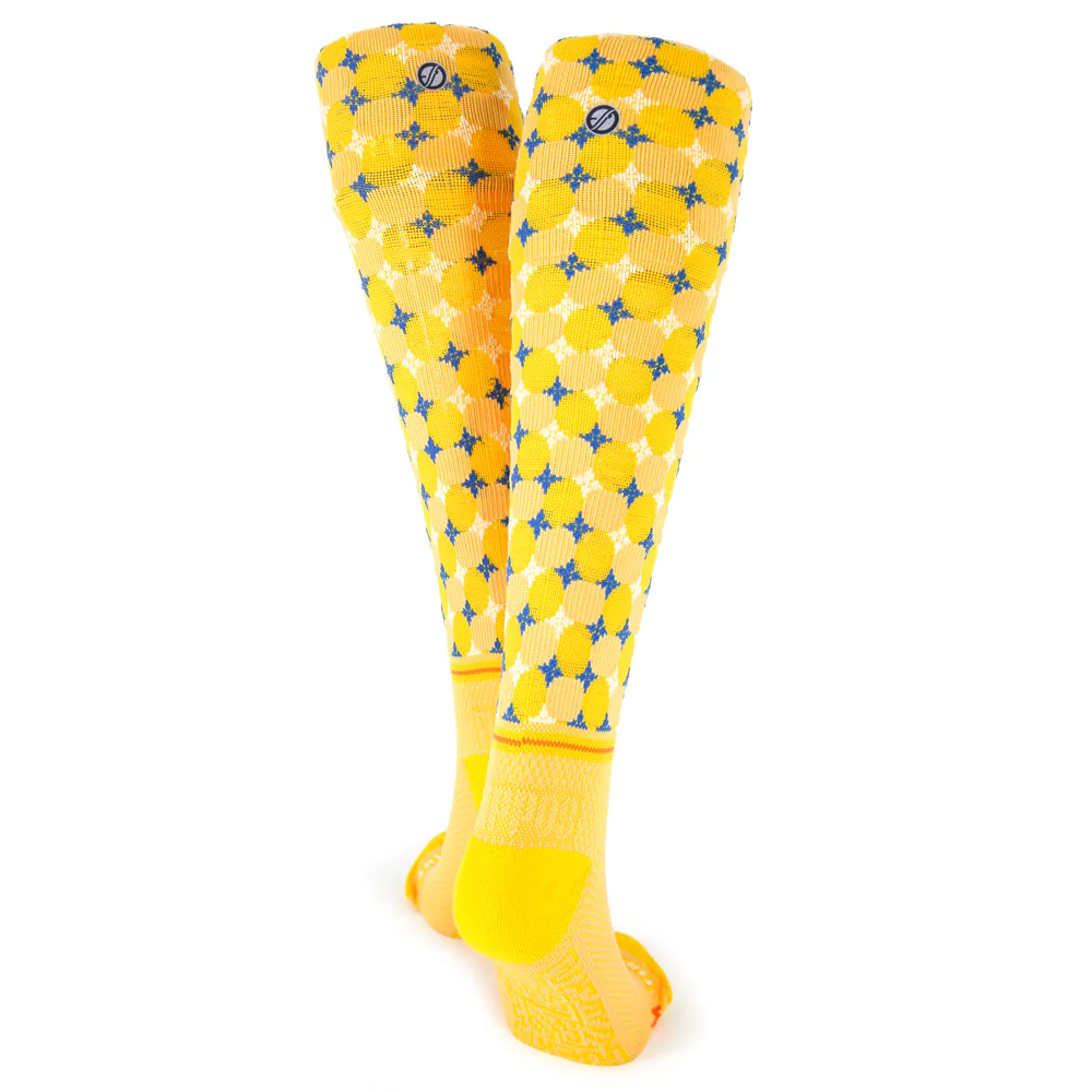 Out Of This World 設計上是採用深淺交錯的圓點,十字與方格,讓人有視覺錯亂的感覺,顏色上使用了代表純真童年的鵝黃色,另外,襪子翻下來後所產生的對比反差,就像走入另一個世界般的美好。