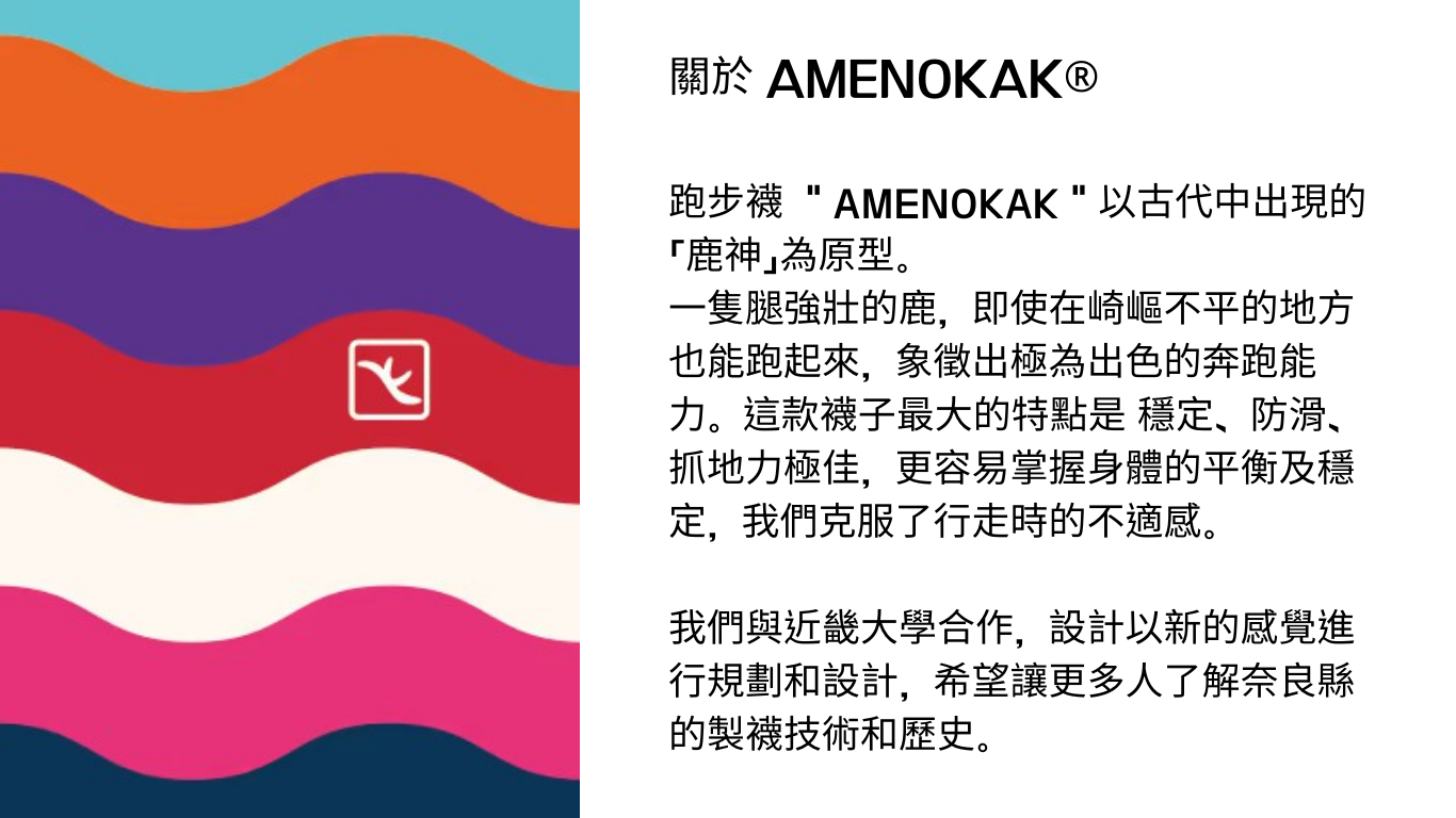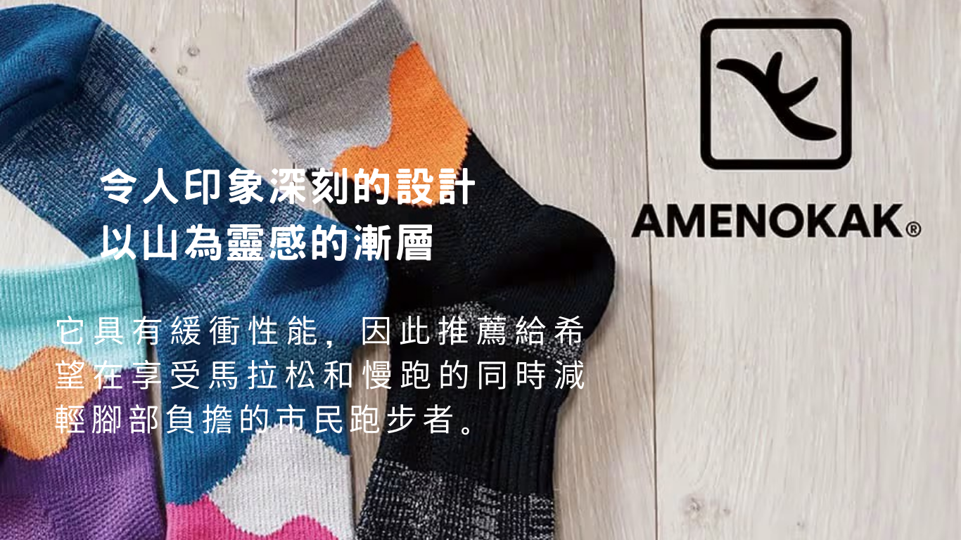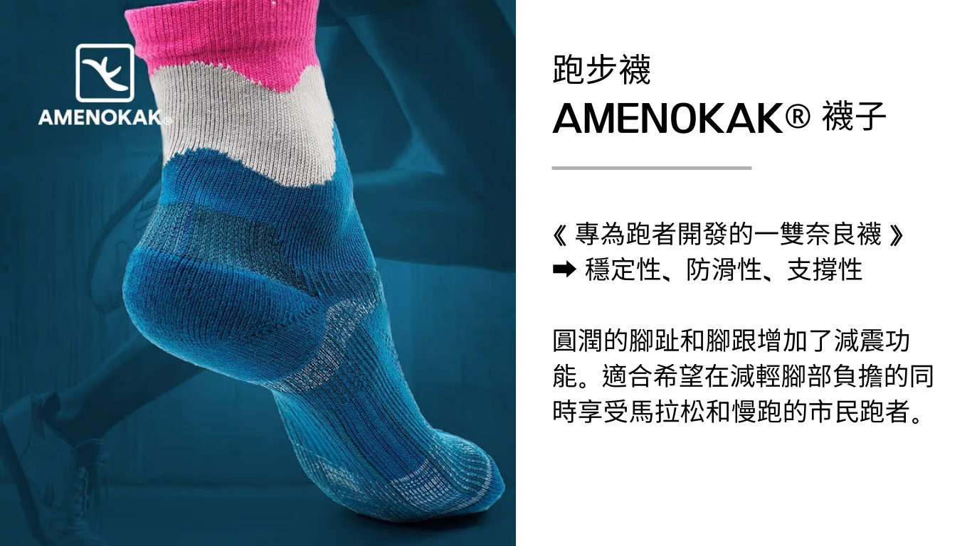 AMENOKAK 襪子是改變跑步的襪子。足底的肌肉,承載著一個人的全部重量,可能會在不知不覺中變得疲倦,足弓可能會脫落。跑步襪 AMENOKAK 是一款從保持足弓和追求最佳形狀的功能出發而設計的襪子。