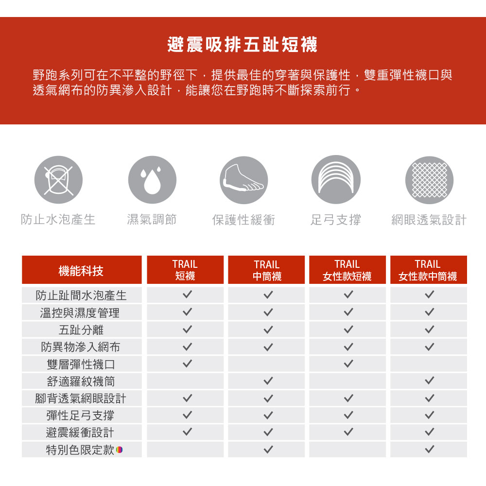 ★ 五趾分離設計,減少趾縫間的皮膚摩擦,避免水泡產生。