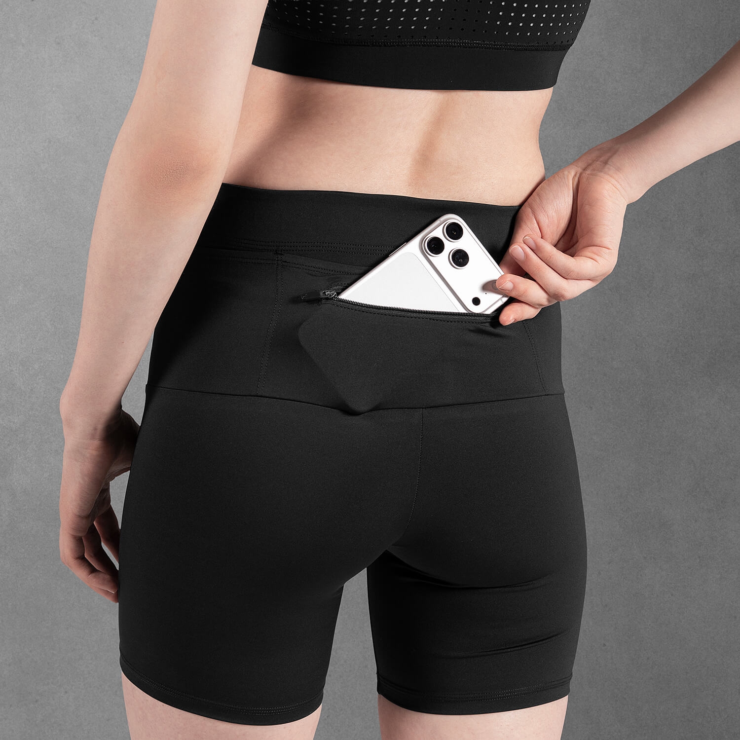 我們針對女性骨盆輪廓優化了中腰版型,後腰的拉鍊口袋可放置手機與能量膠並收納於後腰窩處。