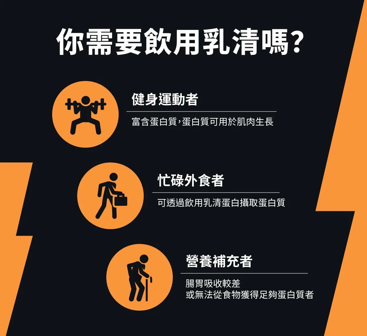 – 忙碌外食者:可透過飲用乳清蛋白攝取蛋白質