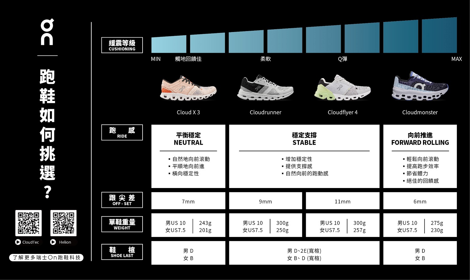 CloudTec®鞋底的專利科技能提供每雙On跑鞋最佳的避震緩衝性。高韌性的氣墊設計能跟隨跑步動態給予最佳回應。鞋底的Cloud元素能各別獨立運作並轉換為動能。強化止滑及抗磨損。